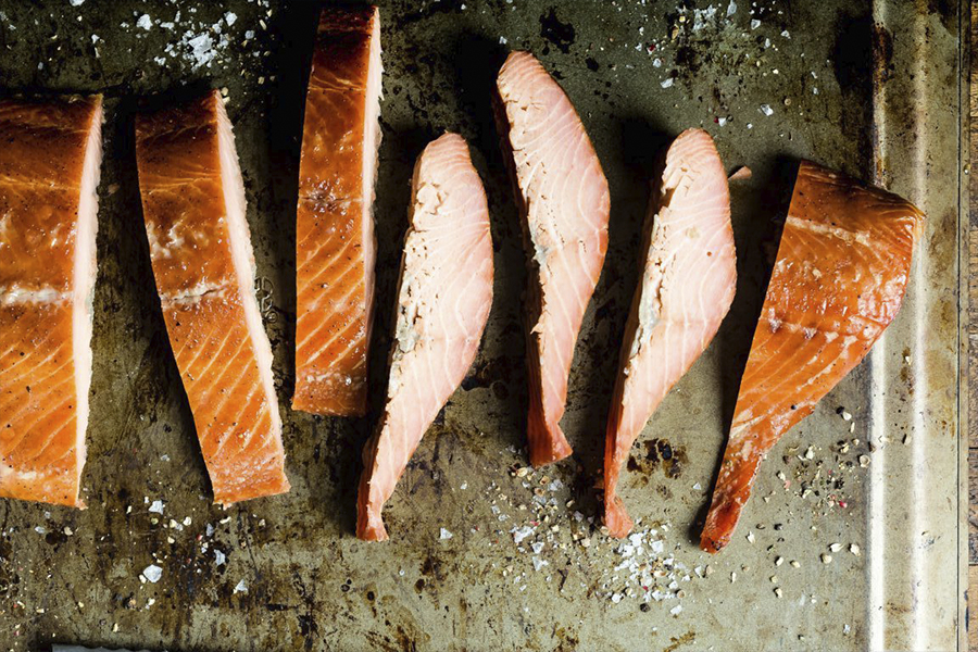 Using applewood chips in your hot smoker, add salmon to smoker once the temperature is steady around 150° F. Smoke the salmon for two hours until firm to the touch, remove the salmon and cover lightly with foil, refrigerate for at least 12 hours.