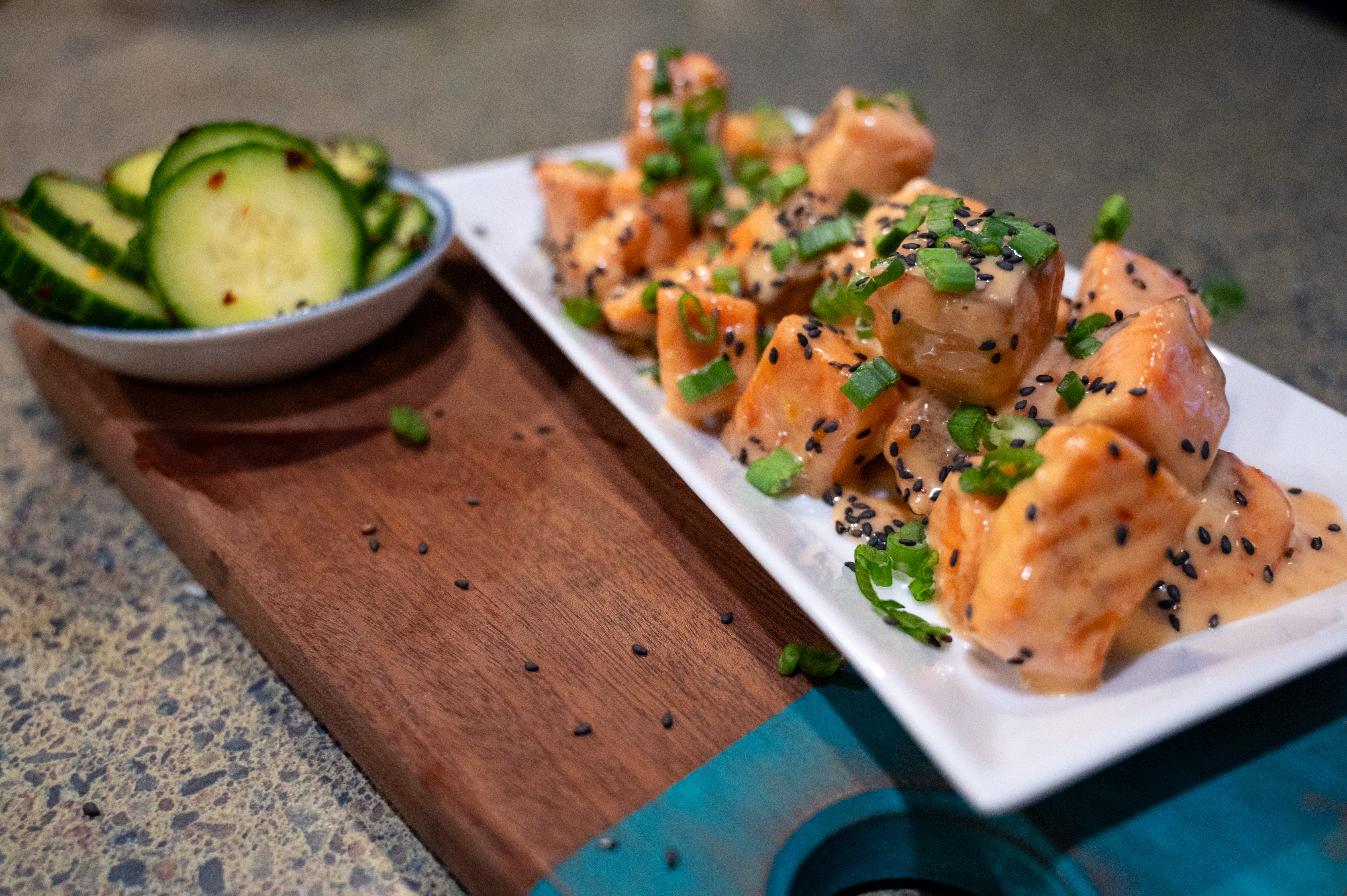 Our take on Bang Bang salmon showcases the delicate balance of sweet, savory, and spicy flavors that characterize the traditional "Bang Bang" dish.