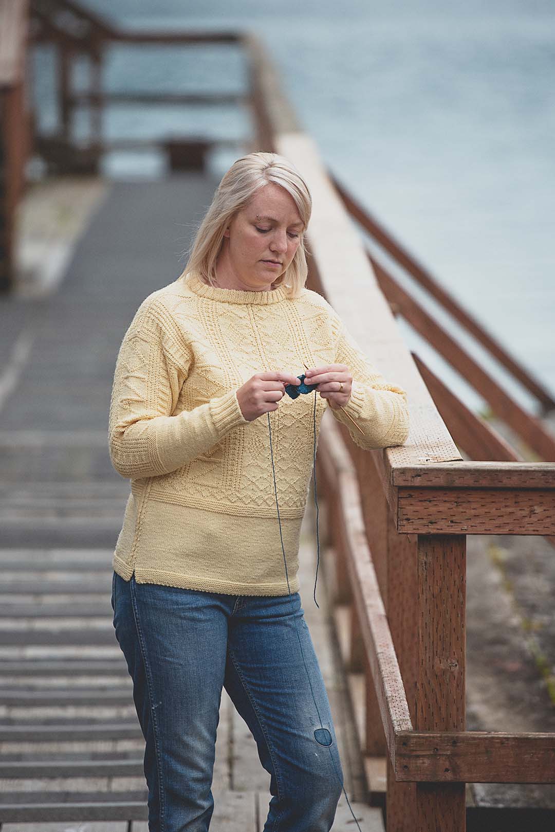 Many project participants have felt a connection to their roots through working with the natural fibers and traditional design. Amber Wasson, one of the local knitters in the project, is a young mother of two and wife of a fisherman. Though born and raised in Cordova, Amber feels a particular connection to the project’s European roots that mirror her own. Like many young fishing families, she sees the completion of the sweater as part of a larger movement towards exploring the past in order to fully embrace the present. “The Cordova Guernsey Project interests me because it breathes new life into history.” She says, “The stories and traditions captivate me… It’s part of our heritage.” Amber’s sweater, made of a pale-yellow wool yarn, was completed during the long winter months and lonely summer days during the fishing season. “It does take a special kind of patience to complete a project like this.” Amber admits of her completed sweater. And patience is one thing that is in no short supply among the wives and families of fishermen, especially in Cordova, where the salmon season alone stretches for five long months.