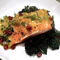 - After sauce is cooled, sear top side of salmon 1-2 minutes in hot pan with oil