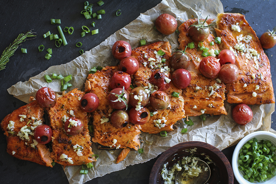 Roasted Salmon with Lemon Garlic Butter and Blistered Tomatoes