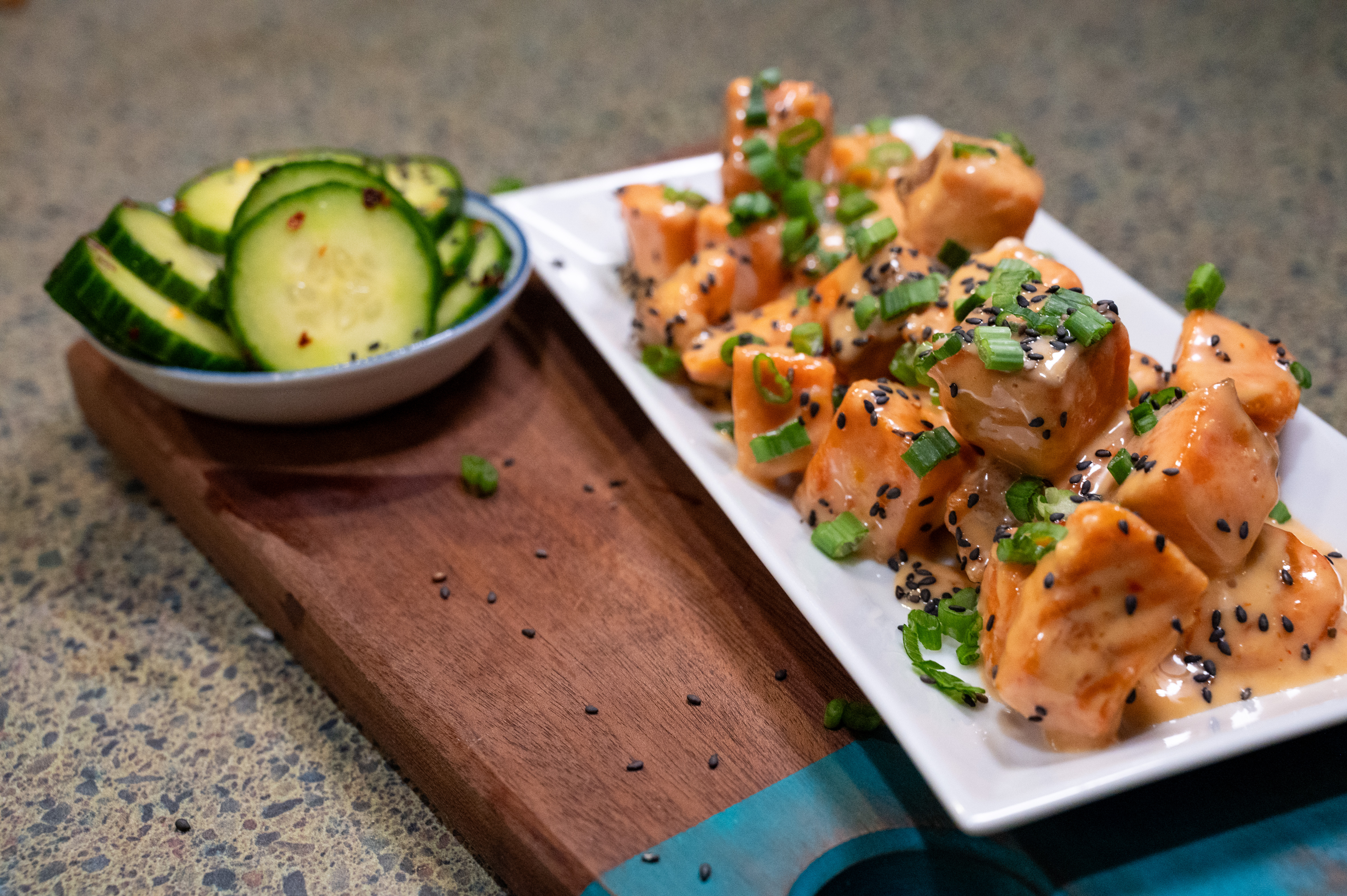 Created with care and attention to detail, these bite-size treats feature cubed and succulent Copper River salmon, delicately seasoned and seared to perfection. Each bite bursts with the freshness of the ocean, complemented by the bold flavors of this signature sauce.