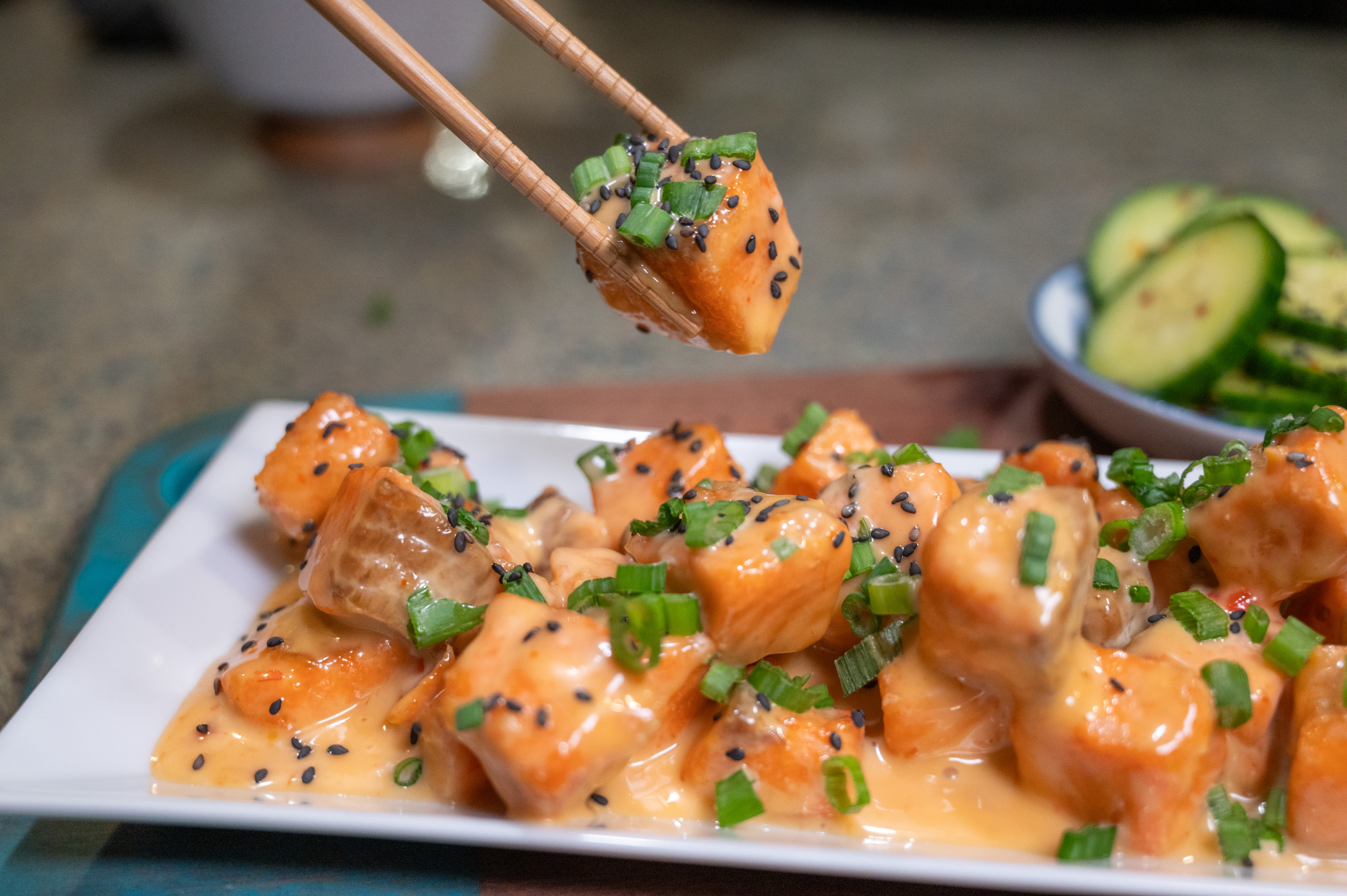Pat the salmon dry and toss with corn starch, gently shake excess with a sieve. Fry in batches until done, do not overcook. A 6” round mesh skimmer is handy for removing batches of fish from the deep fryer. Place in a stainless bowl lined with paper towel to absorb extra oil until all the fish is fried. Remove paper towel and toss gently with Bang Bang sauce just to cover. Serve immediately~