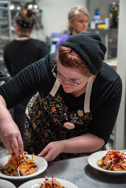 For the past several years, we have sponsored a Chef to prepare this seasonal dinner to marry the fish, forest and fungus theme in their dishes. This year, Chef Lindsay Kucera brought her first-hand forager experience to the dinner. Born and raised in Anchorage, Lindsay Kucera has been on the Rustic Goat team nearly five years. A self-taught baker, cook, and passionate food writer, she believes in the power of food to bring people together. When she is not cooking, she loves foraging, gardening, embroidering, and exploring Alaska with curiosity and intent. Her food directly reflects the feeling of comfort but with a few modern twists.
