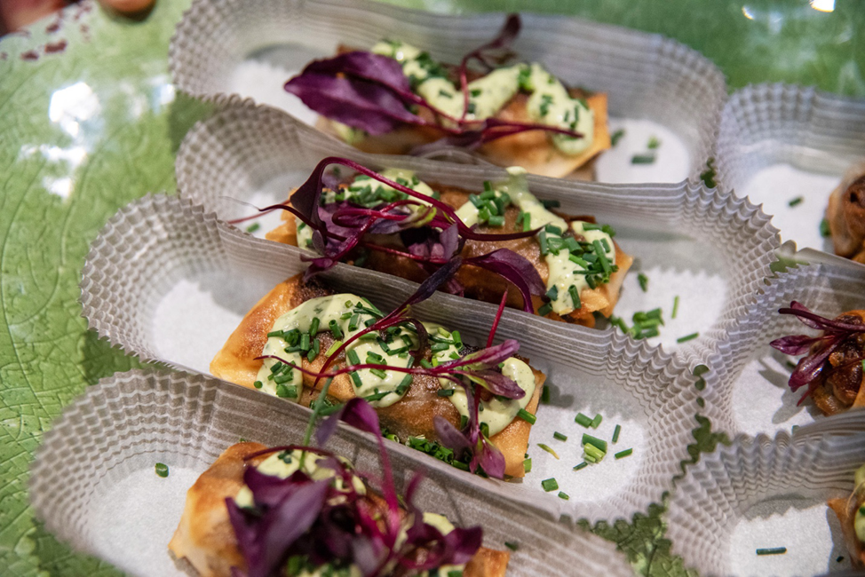 Miniature fried spring rolls filled with wild mushrooms from AK and the PNW (lobster, oyster, chanterelle, cremini), topped with an aioli made of foraged and local greens, bull's blood sprouts, and chives.