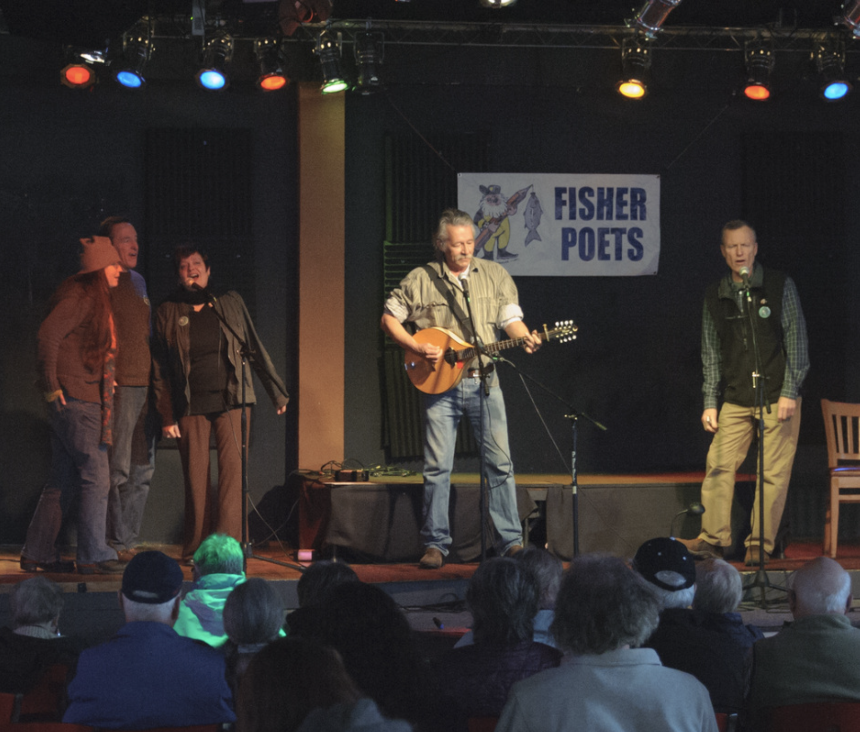Jon Campbell and his impromptu backups: Moe Bowstern, Dano Quinn, Dinah Urell and Jay Speakman. Photo credit: fisherpoets.org