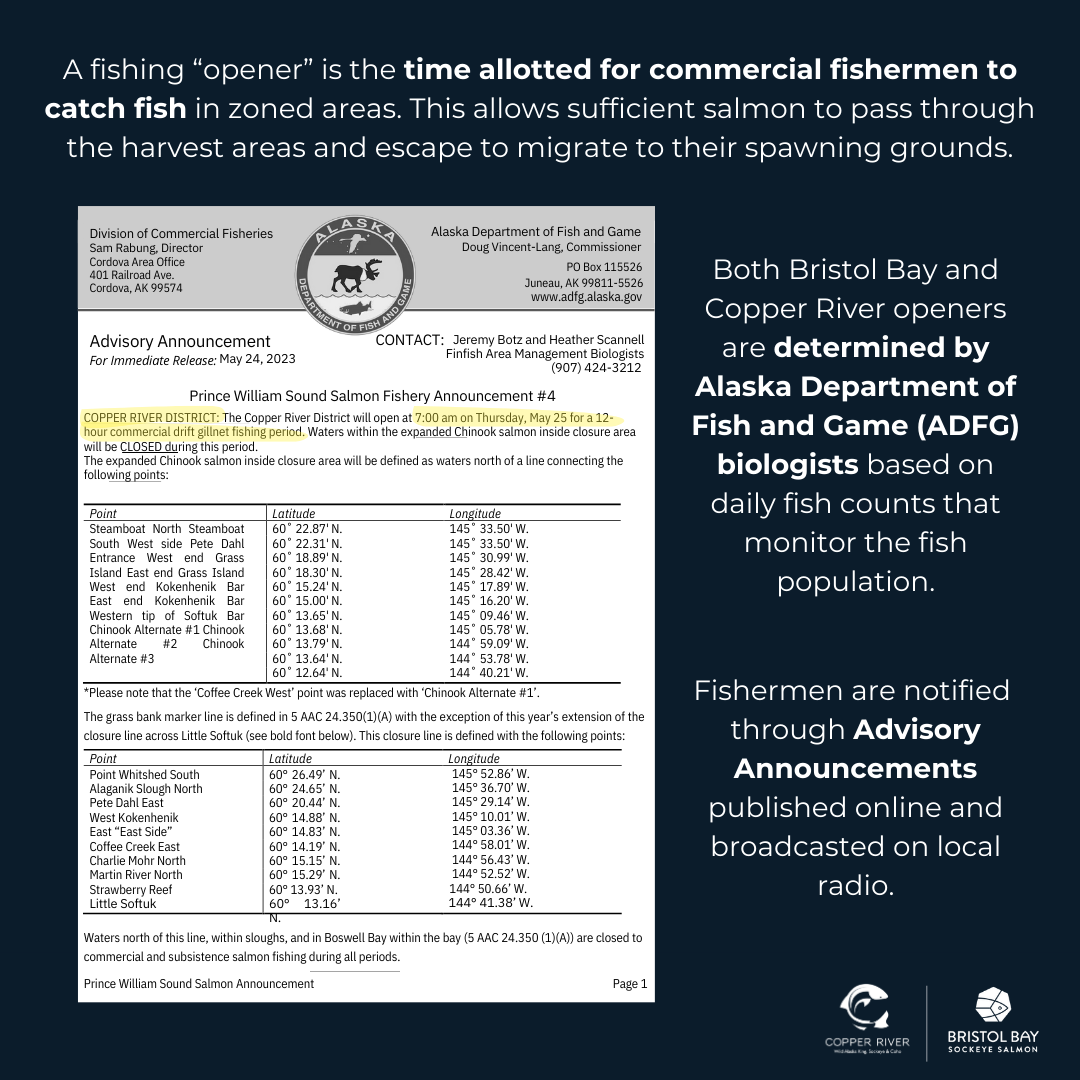 In Alaska, a commercial fishing "opener" refers to a designated period when fishermen are allowed to harvest salmon in specific regions, such as the Copper River, Prince William Sound, and Bristol Bay. These openers are carefully managed by the Alaska Department of Fish and Game (ADF&G) to ensure sustainable fishing practices and protect salmon populations. The ADF&G monitors fish runs in real-time, using sonar, aerial surveys, and in-season data to determine when and where fishing can occur. Openers are often short—sometimes just 12 to 24 hours—and are timed to coincide with the peak of salmon migrations, ensuring that enough fish make it upstream to spawn while allowing commercial harvests to proceed. This balance is critical to maintaining the health of Alaska’s world-renowned salmon fisheries. The ADF&G’s role in regulating openers is rooted in state law, which mandates that fisheries be managed for sustainability and the benefit of all Alaskans. In areas like the Copper River, famous for its prized sockeye and king salmon, openers are tightly controlled to prevent overharvesting and ensure the long-term viability of the resource. Similarly, in Bristol Bay, home to the largest sockeye salmon run in the world, the ADF&G’s management of openers helps balance the needs of commercial, subsistence, and sport fisheries. By setting strict guidelines for when, where, and how much can be caught, the ADF&G ensures that Alaska’s salmon fisheries remain a model of sustainability, supporting both the ecosystem and the livelihoods of thousands of fishermen and coastal communities.