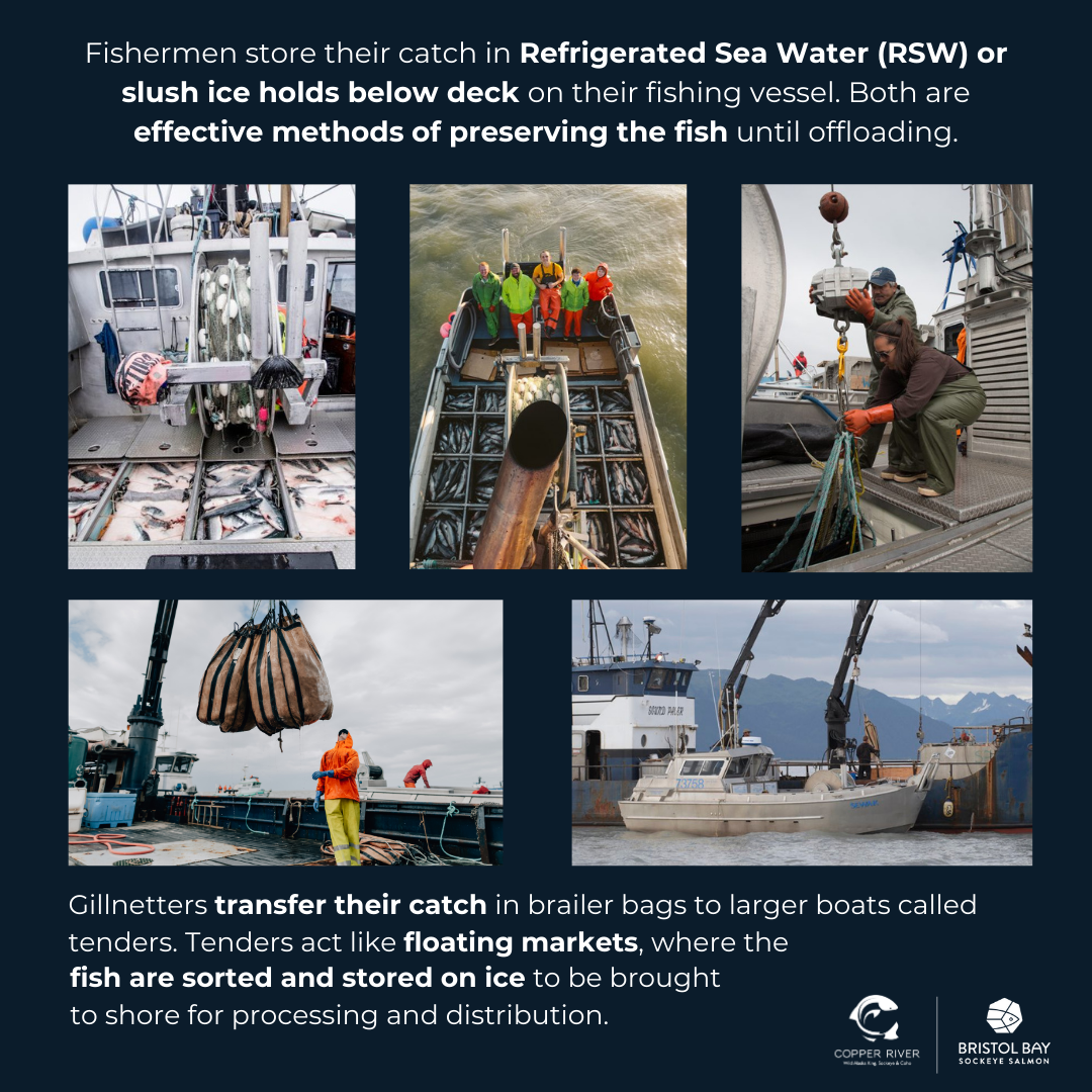 Refrigerated Sea Water (RSW) and slush ice are two critical methods used aboard gillnetters to preserve the quality of salmon before they are delivered to tenders or processors. RSW systems pump chilled seawater into the fish hold, creating a cold, oxygen-rich environment that keeps the fish fresh and reduces bruising or damage during transport. Slush ice, on the other hand, involves layering fish with a mixture of ice and seawater, which maintains a consistent temperature and prevents the fish from drying out. Both methods are highly effective at slowing bacterial growth and preserving the salmon’s texture, color, and flavor, ensuring they meet the high standards demanded by markets and processors. These preservation techniques are especially important in Alaska’s remote fishing grounds, where deliveries to tenders or processors may take several hours or even days. The chain of command for handling fish begins with the gillnetter crew, who carefully sort and store the catch in the RSW or slush ice-filled holds. Once the vessel’s hold is full or the opener ends, the gillnetter delivers its catch to a tender—a larger vessel that collects fish from multiple boats. The tender crew takes over, transferring the fish into their own RSW systems or ice holds for further transport. From there, the tender delivers the salmon to a processing facility, where it is sorted, cleaned, and prepared for market. This seamless handoff—from gillnetter to tender to processor—ensures the fish remains in optimal condition throughout the supply chain. The ADF&G oversees this process, enforcing regulations that guarantee the fish is handled safely and sustainably, from the moment it’s caught to the time it reaches consumers.