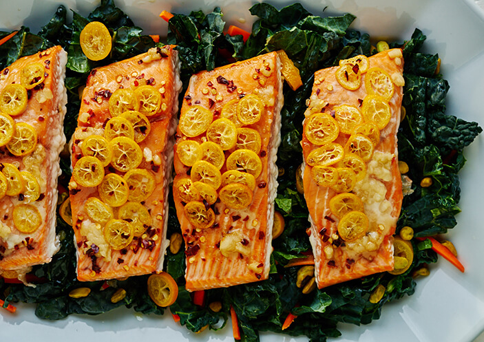 5.Chili Kumquat Salmon with Pickled Kumquat Kale Salad
