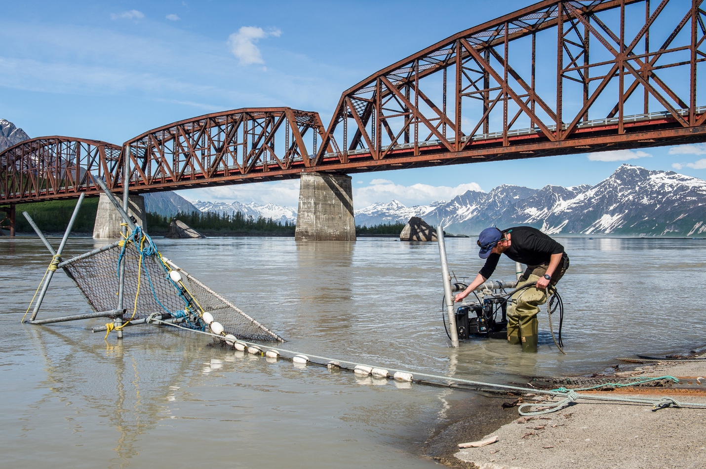 Gathering the data necessary to inform management decisions is not as straightforward as it may seem, however. Even the most fundamental questions, such as “how many salmon return to the Copper River?”, is incredibly challenging to answer. The spawning migration, when salmon gather and begin to move into their home rivers, provides the perfect opportunity to count and catch them which is why both salmon fisheries and salmon monitoring projects occur in the late spring through the fall. In many places in Alaska, a weir is used to count salmon. A weir is a fence built across the stream that prevents salmon from migrating upriver. Throughout the day, a gate is opened in the weir that allows the salmon to swim through, and the salmon are counted visually by hand at that time. In other places, tall towers overlook the river, and observers look down into the river and count fish as they move upstream with the aid of contrast panels laid on the river bottom.