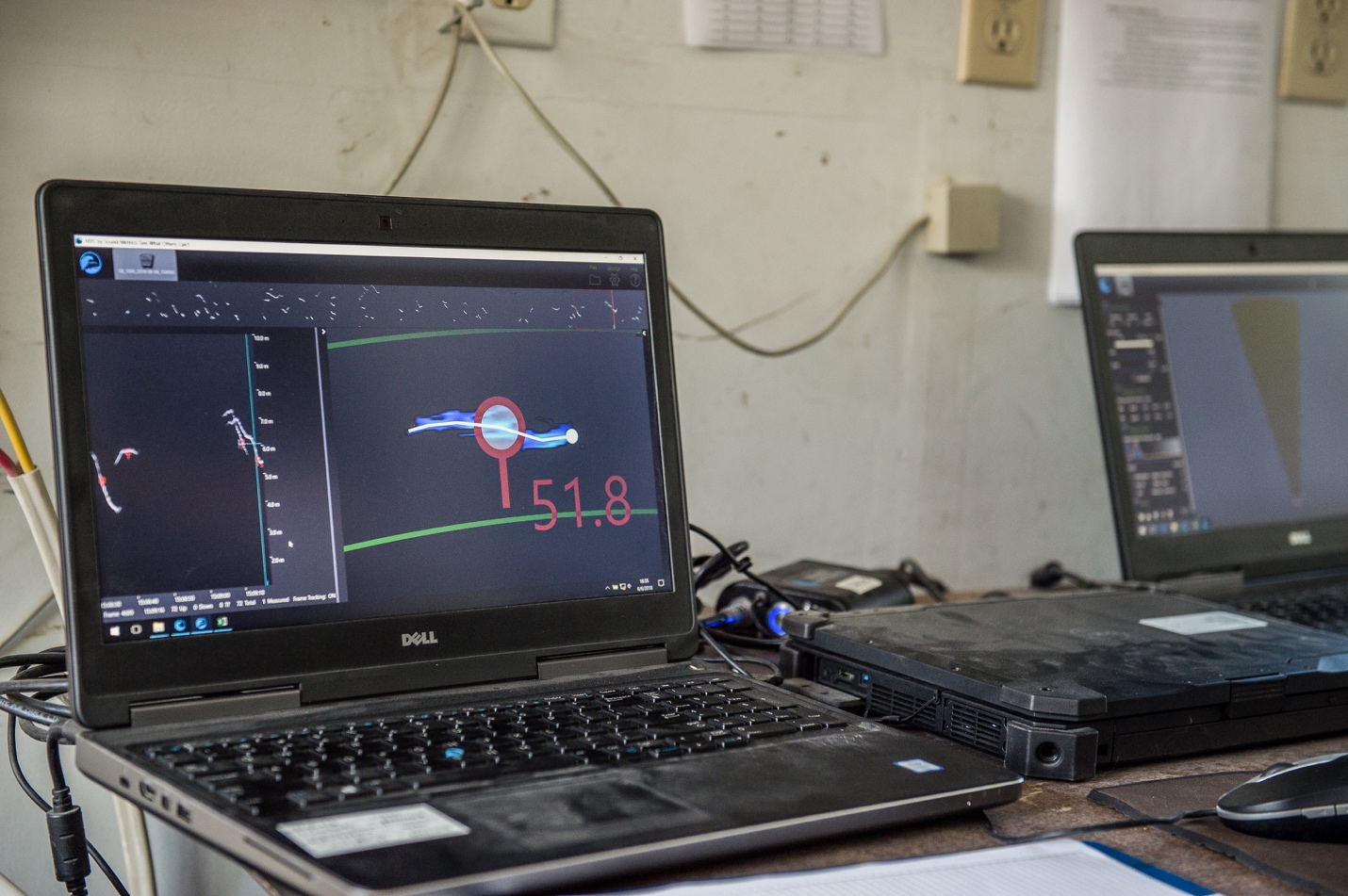 The Miles Lake sonar project started in 1978 using sonar technology called Bendix to count salmon. The sound waves generated by sonar can penetrate the murky waters, although all that suspended sediment does cause interference, and when they hit an object (like a salmon) they reflect an echo back. Sonar technology has developed a lot since 1978, and these days we use a sonar called ARIS by SoundMetrics. It sends 96 beams of sound into the water column in an expanding cone that we aim to cover the entire water column. The ARIS provides high-resolution images that look like a top-down video of salmon as they swim upriver and are clear enough to distinguish salmon from other fish, seals, ice, and debris. We operate the sonar 24-hours a day from the beginning of May until the end of July, making hourly sonar recordings. We then play these recordings back and manually count every salmon that goes upstream and downstream for the length of the recording. Afterwards, the net upstream count is expanded to estimate the number of salmon that passed in that hour, then all the hours of the day are added up to give us a daily total of salmon passage.