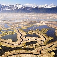 The Copper River, however, presents some unique challenges that make these approaches infeasible. The Copper River drains a large watershed and is primarily glacial fed, and those two factors combine to make it the 2nd largest river in Alaska by discharge (the amount of water flowing out) and one of the siltiest rivers in the entire world. When trying to get the most complete and accurate count of salmon, it is ideal to count them close to the ocean before they split up and begin to travel up smaller tributaries. As the Copper River leaves the Chugach Mountains, it spills out into a large delta of many braided channels that run for miles, and migrating salmon may be coming up a variety of these channels as they enter from the ocean. The first place that all the channels come together into a single main channel is at Miles Lake and the site of the Million Dollar Bridge. Here, the river is sandwiched between mountains and glaciers on either side that keep it constrained to a single channel that the majority of the salmon will pass through. At this point, however, the river is a quarter-mile across and quite deep, with icebergs flowing through from Miles Glacier just upstream, and it would be an exercise in futility to attempt to build a weir across. Counting towers won’t work because the large volume of glacial silt carried by the river makes the water quite opaque — I liken it to gray paint. That’s where sonar comes in.