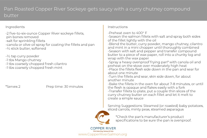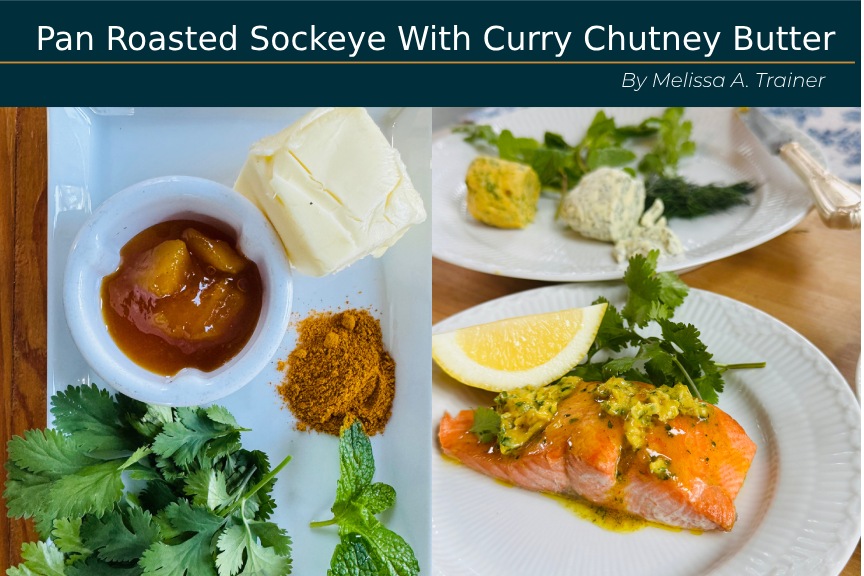 - Transfer fillets to plate, put a couple thin slices of the curry chutney butter on each fillet and let it melt to create a simple sauce.