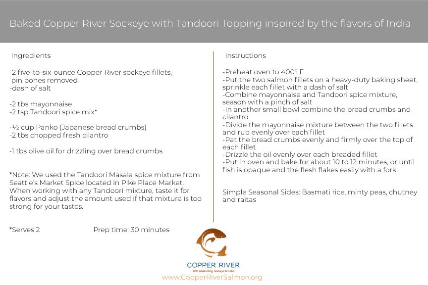 *Note: We used the Tandoori Masala spice mixture from Seattle’s Market Spice located in Pike Place Market. When working with any Tandoori mixture, taste it for flavors and adjust the amount used if that mixture is too strong for your tastes.